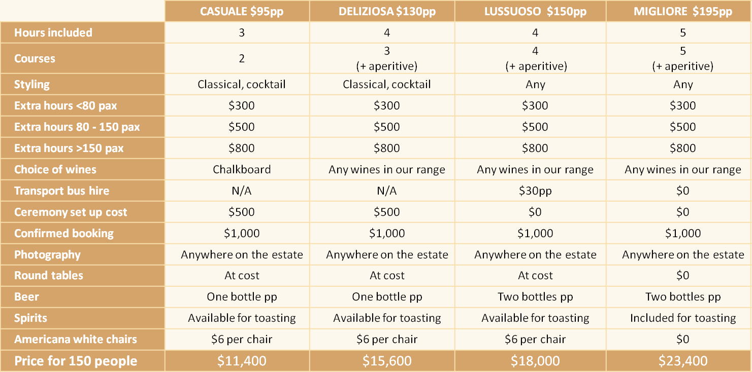 We will spend time with to ensure that you can what you want, rather than squeeze you into one that suits us. For example, our package includes some free Peroni beer. You can supplement this with beer of your choice, which we will store in our cool room and serve on the night. As a producer of wines specifically dedicated to match good food, we don’t have to resort to inferior bought-in wines to preserve our margins. The wines that you choose will be delivered in effect at wholesale prices. And all our wines are available; mostly within the package you select.